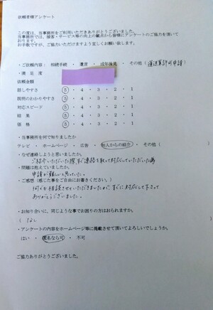3.依頼の理由:法務局に行って名義変更の話をした時に、自分で行うか専門家に頼むか聞かれ、専門家に依頼すると言ったが特定の司法書士を紹介してくれなかった。自分でスマホを使って無料相談所に電話をして、満村さんを紹介してもらった。